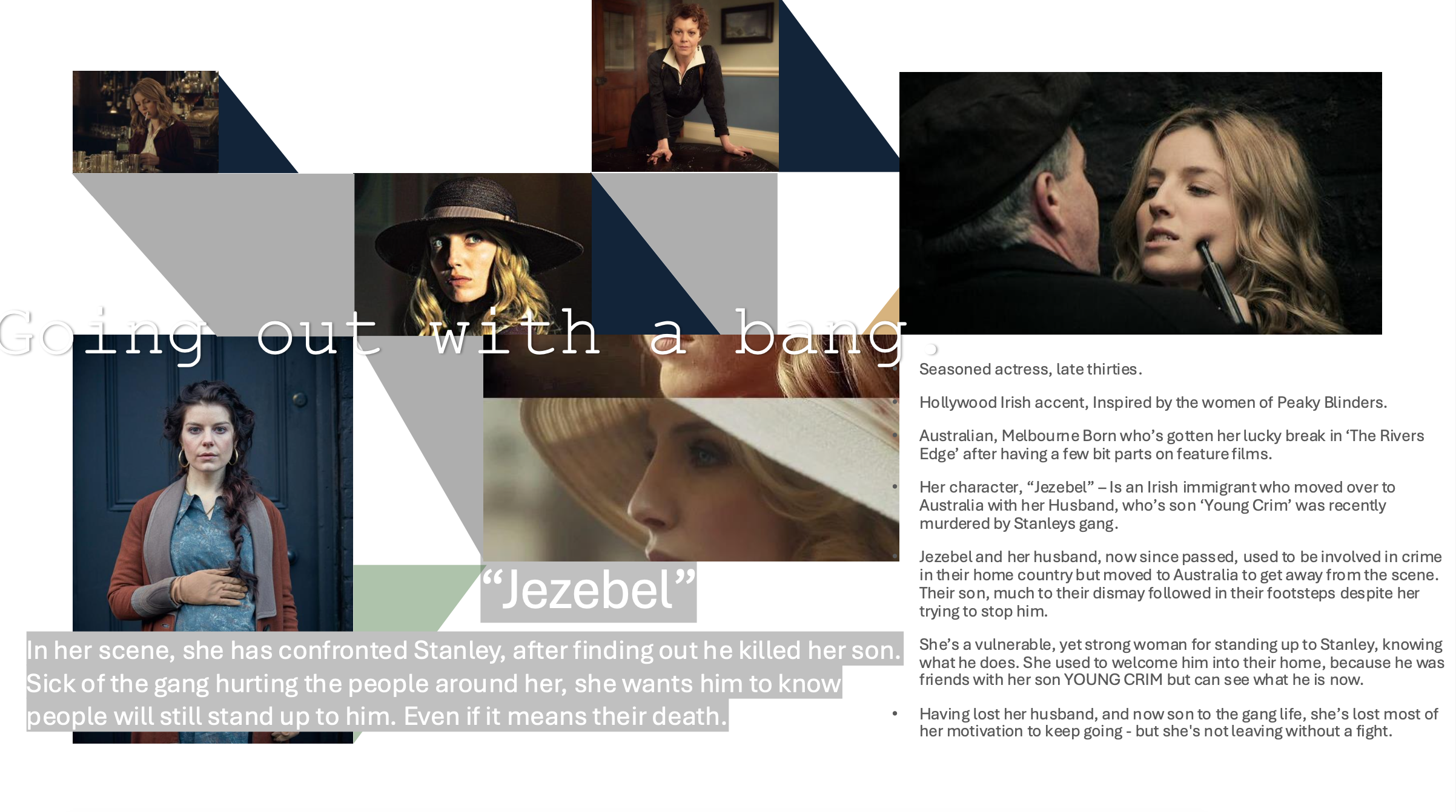 Also voice-acted by Danika Peets. Inspired by the female characters in UK crime drama Peaky Blinders (2013), Peets utilises a standard Irish accent to support Jezebel’s immigrant background and help seperate her voice from Victoria Langford. Another character profile had been created to help inform Peets’ choices for Jezebel. Aligning with the ongoing thread of strong female characters in Fractured Sanity, Jezebel provided Peets with an opportunity to dip into heightened emotional intensity and vulnerability within the scene to support the characterisation of Elias/Stanley.