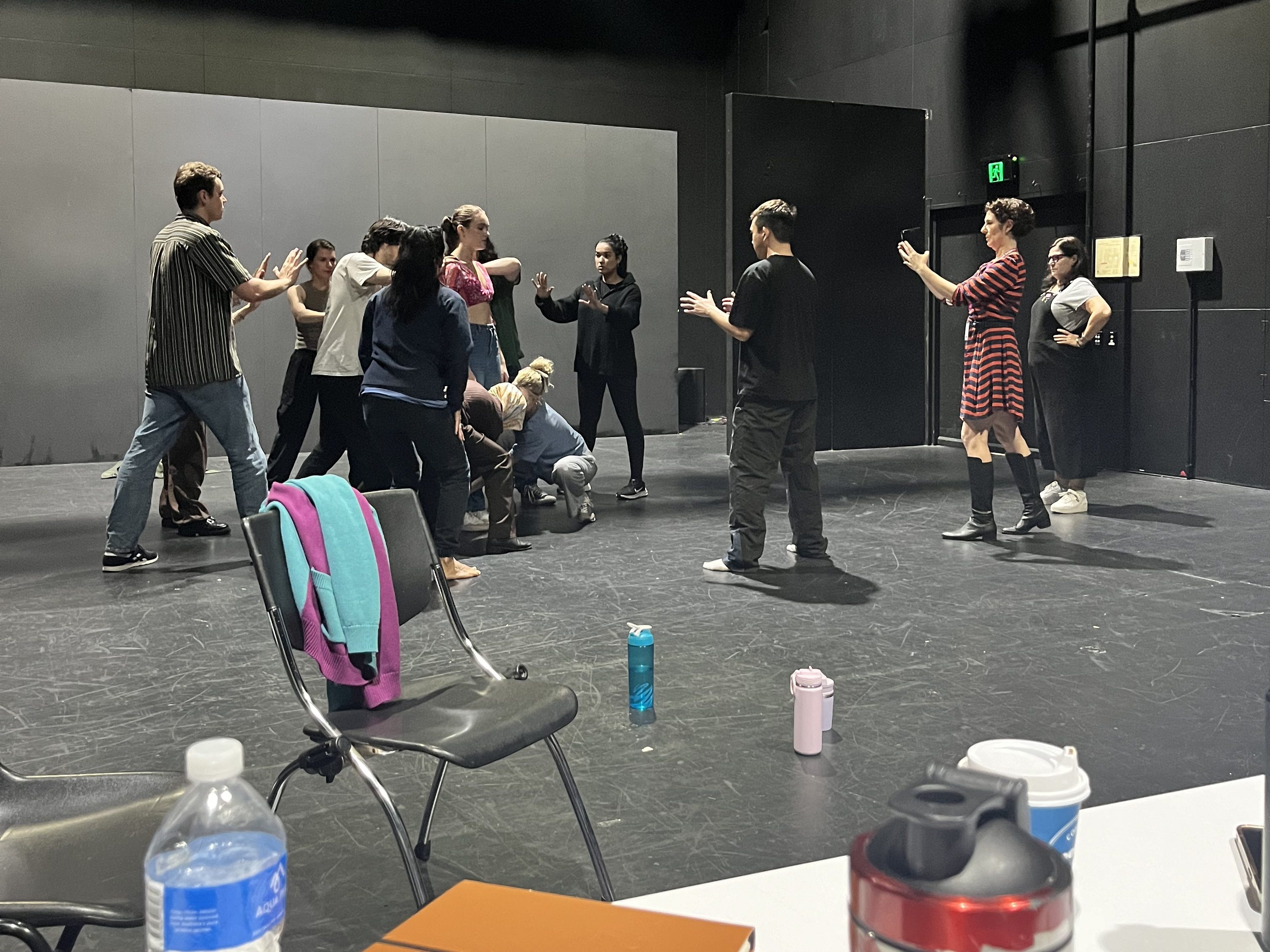 Exploring physical movement pieces with actors in rehearsal room